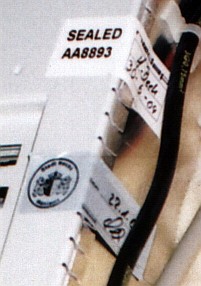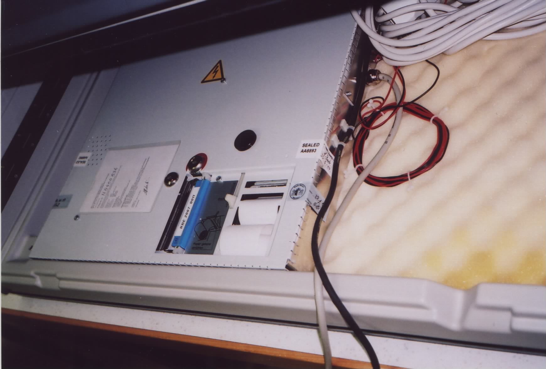 Gegen 7:10 Uhr wird der Wahlcomputer gebracht. Der Fahrer (PKW mit Neusser Kennzeichen) legt den Koffer mit dem Wahlgerät im Wahlraum auf einen Tisch. Das Wahllokal wird etwas eingerichtet – Stühle raus, Tische an die Seite. Das Gerätegehäuse ist durch eine Kordel mit weißem Siegelpapier der Stadt Neuss versiegelt. Daran sind zwei Schlüssel befestigt. Auf einem kleinen Typenschild am Gerät steht: Wahlgerät ESD1 Software 3.08 und eine Seriennummer. Einen unbeaufsichtigten Zugang zu dem Wahlgerät hatte ich nicht.